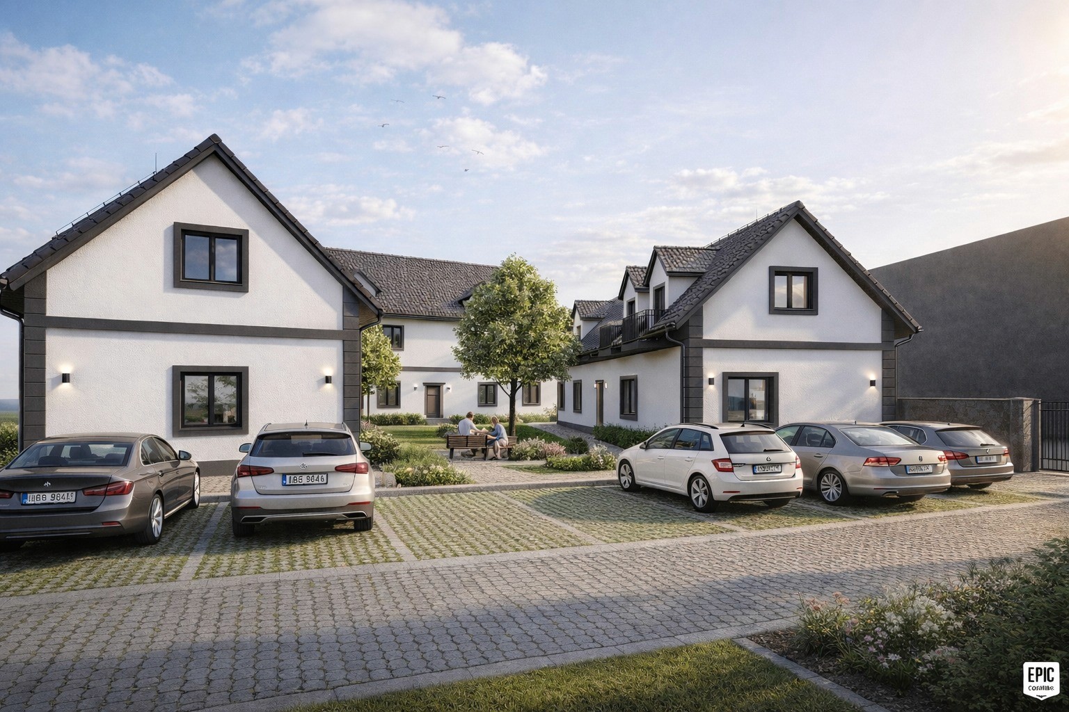 Moderní jednotky jsou součástí komorního projektu se společnou zahradou, upravenou zelení a bezpečným vnitroblokem pro odpočinek i rodinný život.