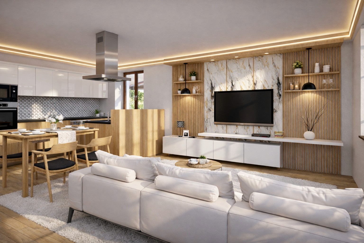 Každý detail jsme navrhli s důrazem na kvalitu, světlo a nadčasový design. Prostor propojuje přírodní materiály, jemné barevné tóny a moderní prvky tak, aby vznikl harmonický domov pro každodenní život.